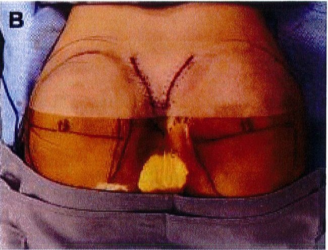 Hình. 8. (A) Phẫu thuật được lên kế hoạch, sử dụng các tiêu bản phù hợp với vùng mông của bệnh nhân với các đường rạch dài 6cm ở hai bên, trên vị trí hậu môn ít nhất 5cm. (B) Đây là hình ảnh bệnh nhân với tiền sử có bệnh lý liên quan vùng mông, đồng thời đã từng thực hiện hút mỡ mông trước đó, nên chúng tôi quyết định đặt đường rạch cao hơn bình thường để tránh các biến chứng.