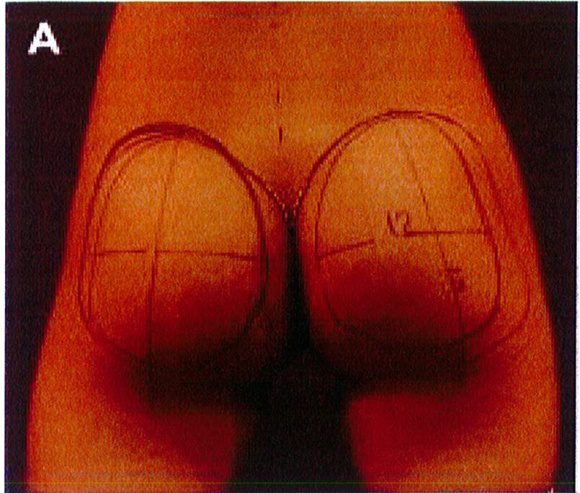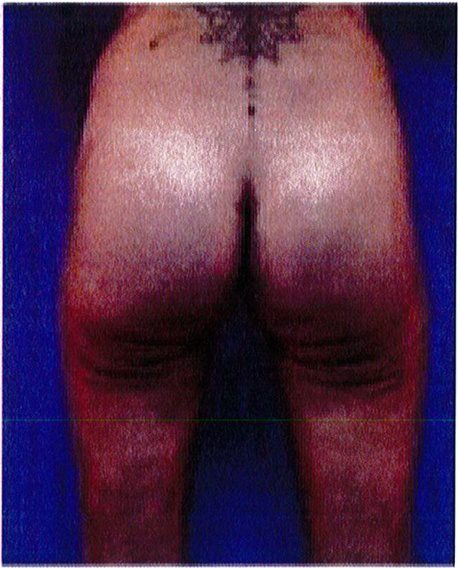 Hình. 16. Hình nhìn từ phía sau các khối implant ở đúng vị trí trong mối tương quan giữa xương cùng, rãnh liên mông và giới hạn ngoài cơ mông lớn. Đường giữa được vẽ nét liên trên hình đi qua cả hai đường đánh dấu của khối implant. (Trích từ de la Pena JA. Subfas -cial technique for Gluteal Augmentation. Aesthet Surg J 2004;24:269. đã xin phép trước khi đăng tải.)