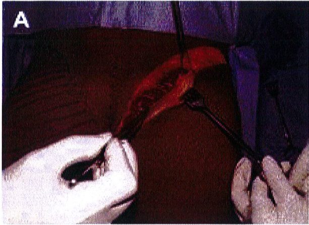 Hình. 6. Rạch da cạnh xương cùng, thực hiện bóc tách theo một góc nghiêng từ đường rạch tới giới hạn là đường bờ ngoài xương cùng. Sau đó tiếp cận tới lớp cân nông, rạch cân và đặt túi cấy dưới cân, trên bề mặt cơ mông lớn. (Trích từ de la Pena JA, Rubio OV, Cano JP, et al. Subfascial Nâng mông. Clin Plast Surg 2006;33÷411; đã xin phép trước khi đăng tải.)
