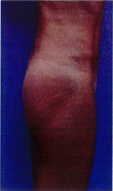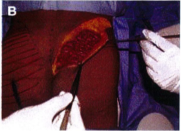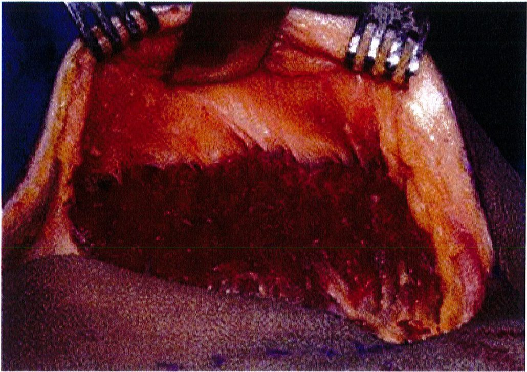 Hình. 13. Bóc tách lớp dưới cân của một tử thi và nâng lên để quan sát. Đường rạch lớn như thế này chỉ với mục đích quan sát và minh họa quá trình phẫu thuật, không áp dụng trong lâm sàng. Trong thực tế, một đường rạch tiêu chuẩn chỉ dài 6-7 cm. (From de la Pena JA. Subfascial technique for Nâng mông. Aesthet Surg J 2004;24:268; đã xin phép trước khi đăng tải.)