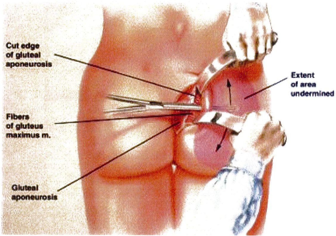 liên quan tới mặt phẳng implant, việc tìm ra một mặt phẳng khác có thể implant để hạn chế tối đa những thiếu sót của các ký thuật khác là điều cần thiết. Và mặt phẳng dưới ra đời (Hình 1). Kỹ thuật này được phát triển dựa trên nhiều nghiên cứu trên các tử thi nhằm phân tích các lớp giải phẫu riêng biệt. Cân vùng mông bám rất chắc ở cả nguyên ủy và bám tận của nó. Chúng bao phủ cơ mông lớn, là cấu trúc lớn nhất và nông nhất ở vùng mông, đóng vai trò quan trọng trong việc tạo nên hình dáng của mông.