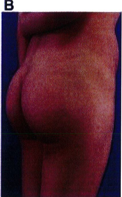 Hình. 19. . (A) Hình anh trước và (B) và sau phẫu thuật làm đầy mông của bệnh nhân chùng da vùng mông tương đối nhiều. Bệnh nhân được đặt khối implant dưới cân thể tích 330 mL ở hai bên.
