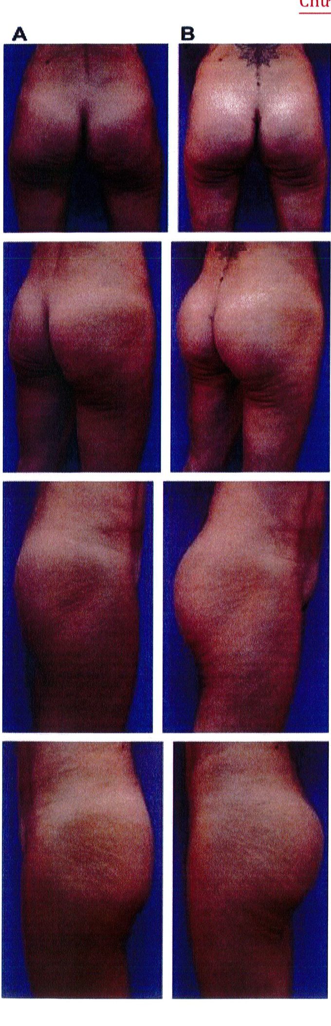 Hình. 20. (A) Hình anh trước và (B) và sau phẫu thuật làm đầy mông của bệnh nhân có vùng mông tương đối đầy đặn. Bệnh nhân được đặt khối implant dưới cân thể tích 330 mL ở hai bên.
