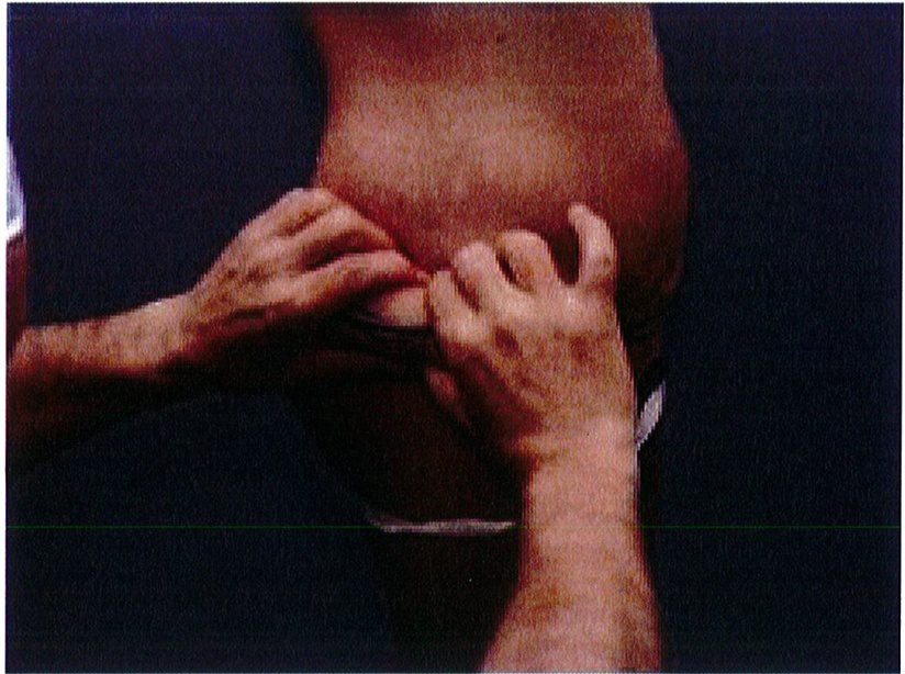 Hình. 2. Nghiệm pháp véo da bằng hai tay được thực hiện ở đường nách trước. Để bệnh nhân nghiêng người sang bên đối diện để tránh cắt đi quá nhiều mô.